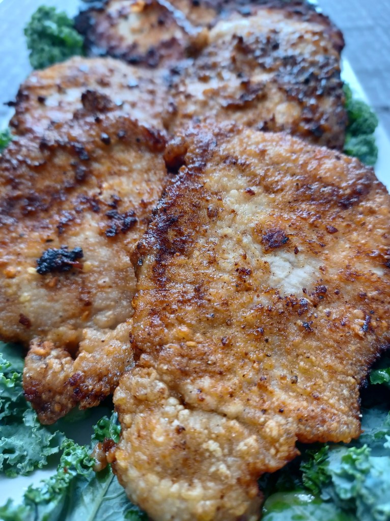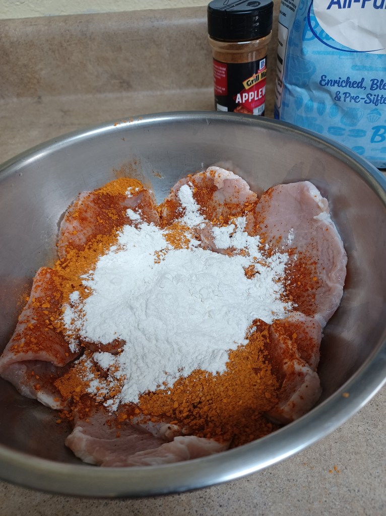 | * Pork chops – 6 to 8 pcs. * Flour – ½ cup (Or Cornstarch for gluten-free diet) * Any store brand marinade rub – 1/4 cup (Or mix together: Salt – 1 Tbsp, Pepper – 2 Tsp, Garlic Powder – 2 Tsp, Paprika – 1 Tsp) * Frying oil – as needed | 1. Wash the pork chops and pat dry using a paper towel. 2. Gently pound the chops using a mallet to slightly tenderize the meat. 3. In a bowl, mix together all the dry ingredients. 4. Dredge the chops generously in the dry mixture. 5. Heat the frying pan and fry the chops until brown. 6. Best served with any dipping sauce of choice. |