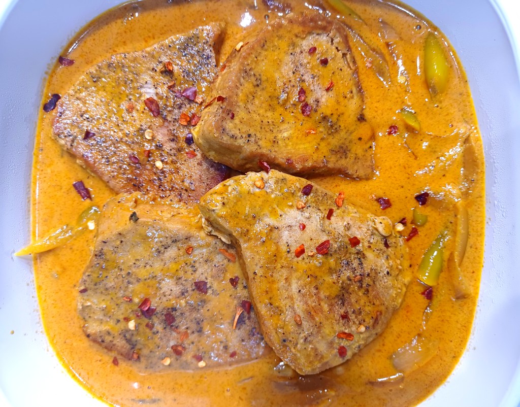 Ahi Tuna steaks, Frying oil, Coconut Cream, Banana Peppers, Spices, Garlic, Curry Powder, Cumin Powder, Red Pepper Flakes